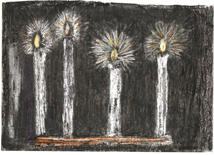 <MODELLE ZEICHNUNGEN BILDERKerzen, Zeichnung nach einer Abbildung in einem jüdischen Betraum in Theresienstadt, 2007>